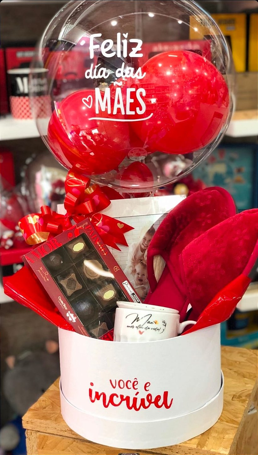 A cesta vem com embalagem branca redonda com frase "Você é incrível", acompanhada por balão transparente com balões vermelhos internos, laços vermelhos, uma caixa de bombons, caneca de cerâmica branca com frase especial e pantufa vermelha macia. É perfeita para criar uma experiência completa de carinho e cuidado no presente.